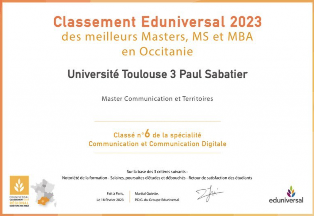Le Master 2 Communication et Territoires progresse dans le classement national des Masters en Communication !